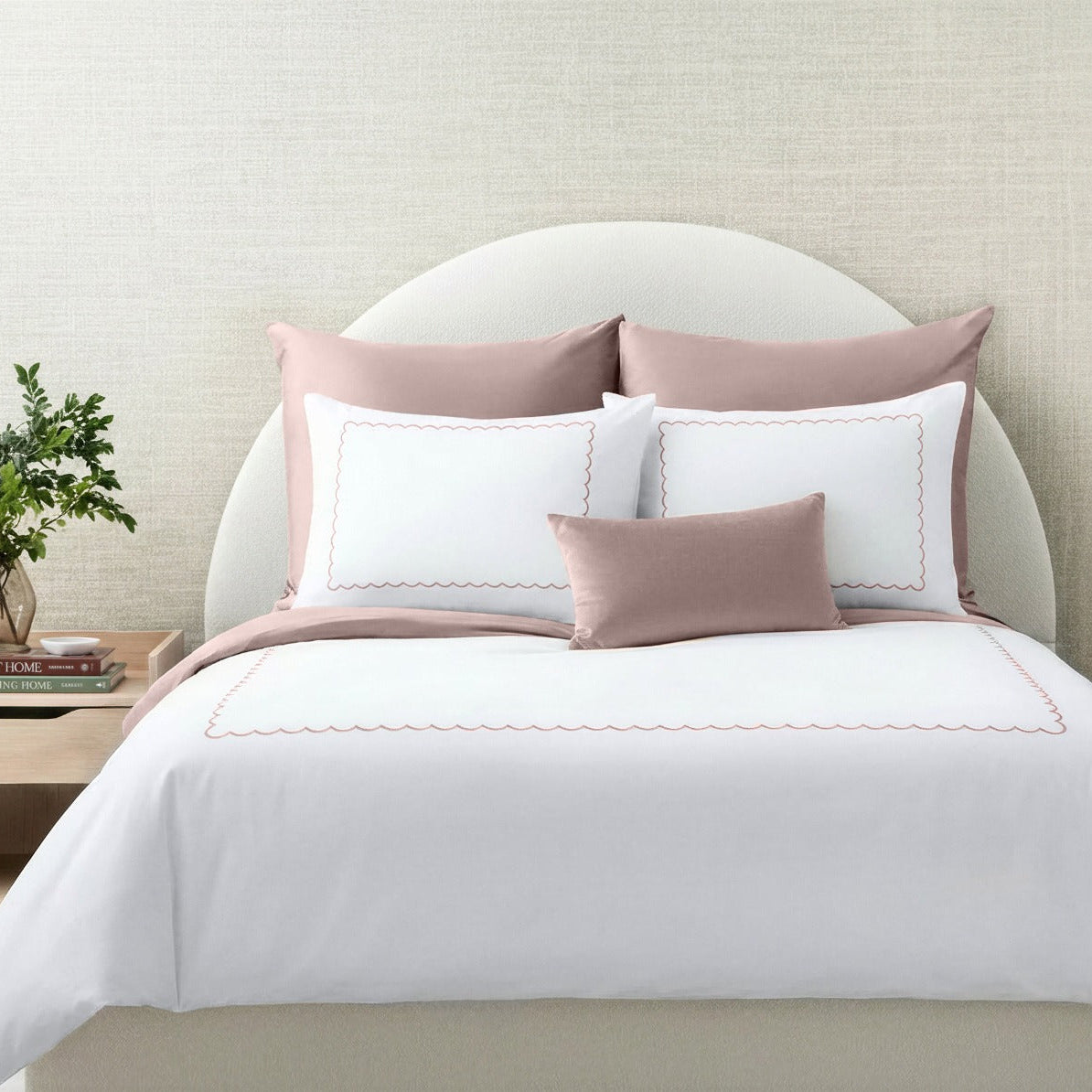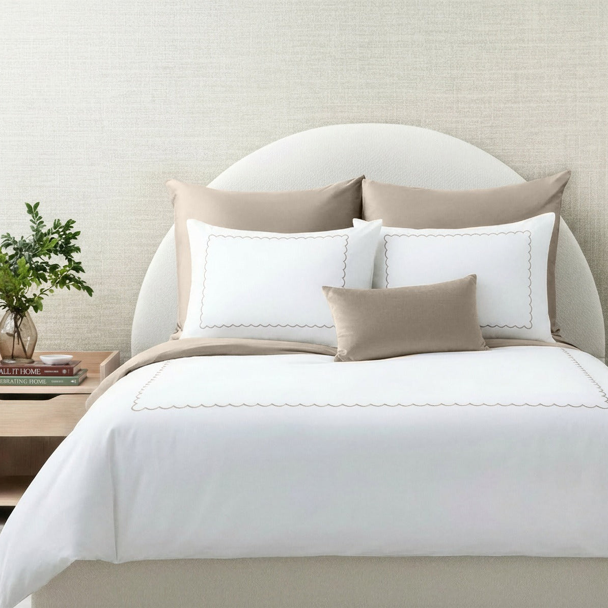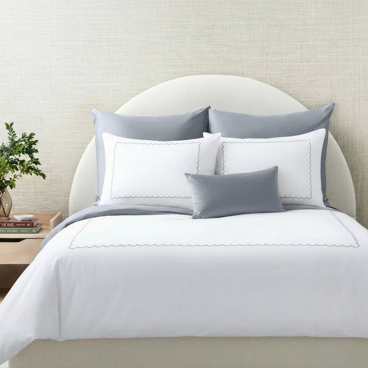 Give your bedroom a chic, hotel-inspired look with Vera! The crisp white duvet cover and pillow shams feature a single scalloped embroidery, adding a subtle, stylish detail that elevates the look. Pillowcases are available in solid color envelopes as well as embroidered pillow shams, allowing for versatile styling. The embroidery comes in taupe, grey, blue, and pink, with a white underside and fitted sheet that makes layering and styling your bed effortless.